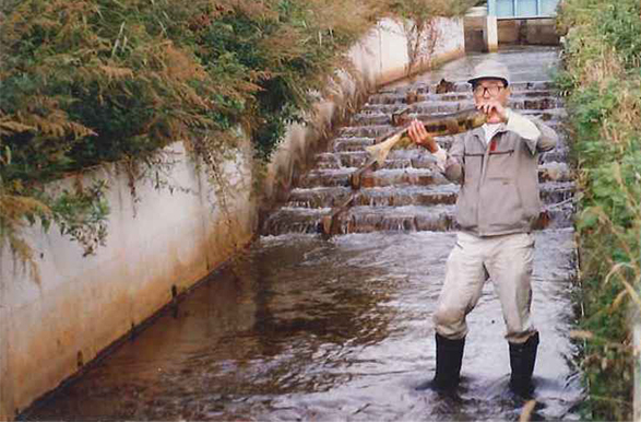 魚道付き落差工・ 落差工で魚介類が遡上、降下できるようにした生態系水路です。