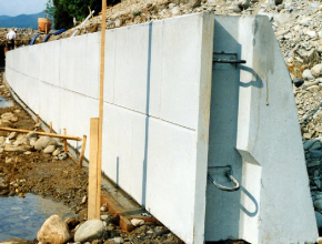 | 特徴 | 主として道路、河川、宅地造成などに用いるブロック式擁壁です。 河川の流速に対し、ブロック施行突出部が、「千鳥」構造となるので流速を抑制します。施工時法面に対し前面接触と成らず、突出突き当たりのため「砂咬み」現象がなく施行が容易です。 |
